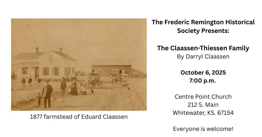 Local historian Darryl Claassen will present, “The Claassen-Thiessen Family,” at the Frederic Remington Area Historical Society meeting on Monday, October 6 at 7:00 p.m. at the Centre Point Church, 212 S. Main, Whitewater, Kansas. Admission is free.